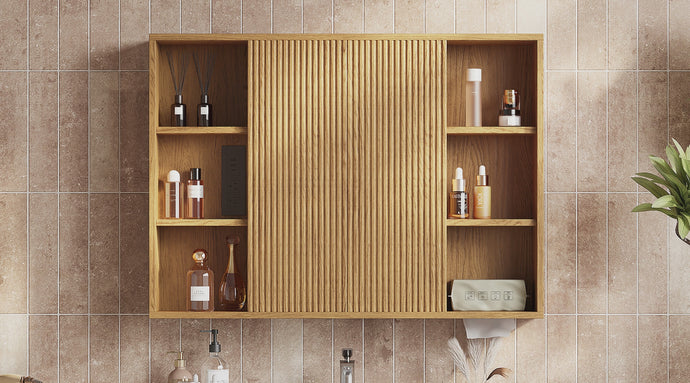 Six open cubbies on both sides keep daily essentials sorted and visible, while the door glides left or right to conceal clutter or highlight display. Inside, the left compartment includes a built-in hair-dryer outlet, and the right compartment features a bottom tissue-box opening for easy access. A true multitasker—mirror, cabinet, and organizer in one sleek unit.
