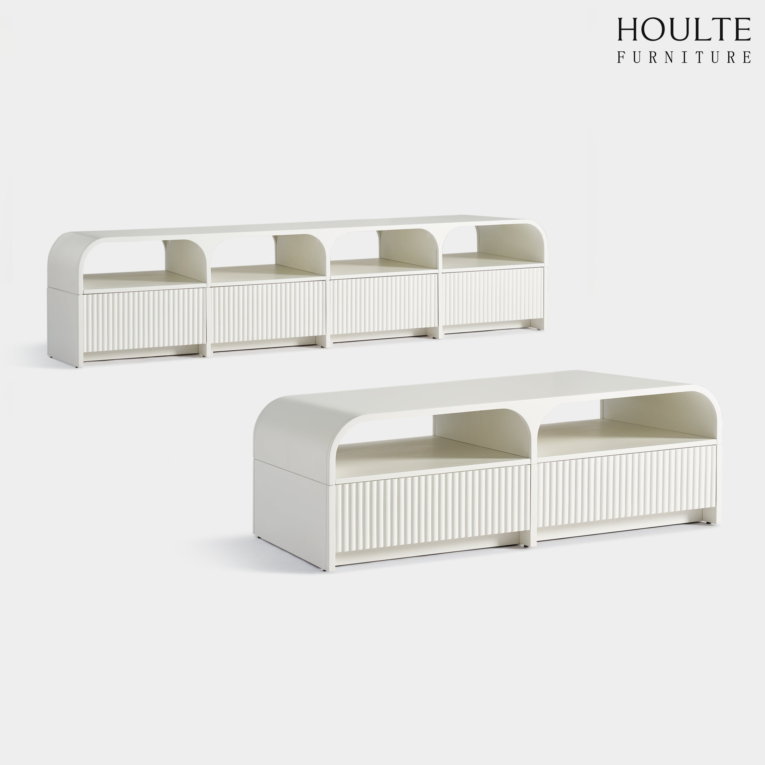 This furniture features a classic arched stripe design with white matte laminate for a clean, layered look. Its matte finish adds warmth and easy care, while sturdy 18mm construction ensures durability. Blending vintage and modern styles, it enhances any space with beauty, practicality, and lasting quality.