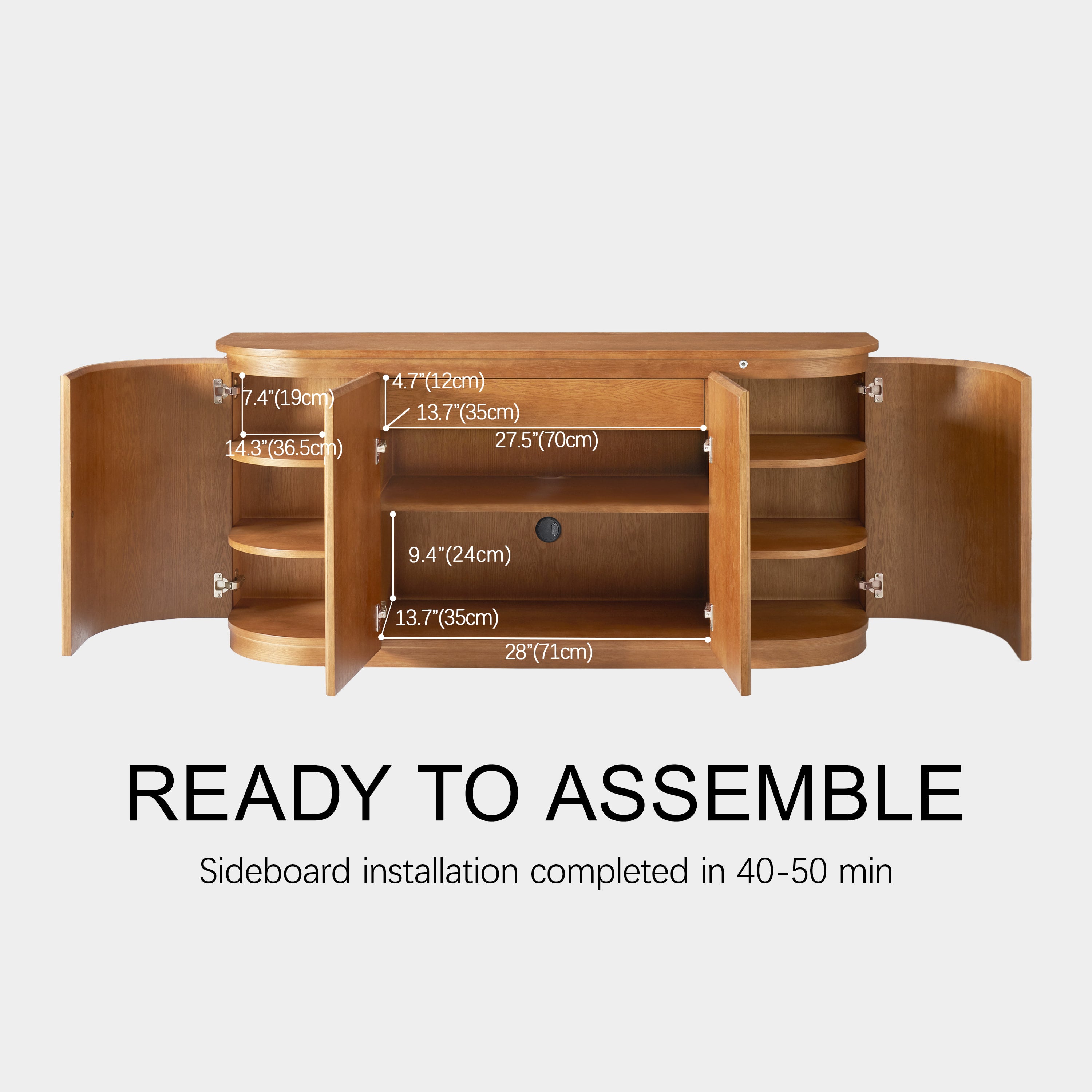 The curved-edge door design is excellent, and the entire sideboard looks beautiful. Once assembled, it is very sturdy. The color matches the pictures perfectly. Overall, it was a great purchase!