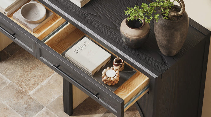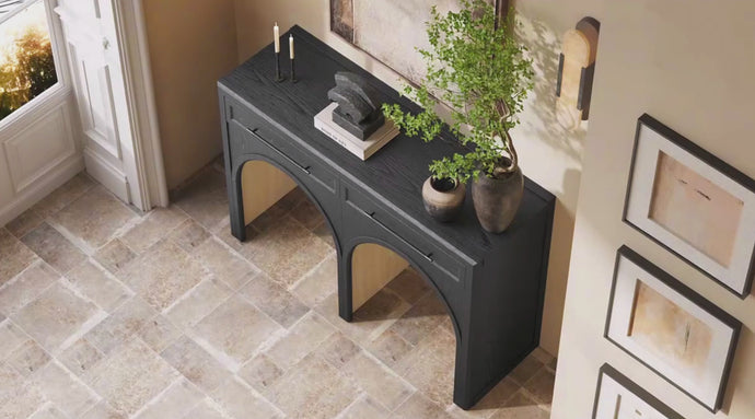 The Alvar Console Table 47" balances refined craftsmanship with architectural clarity. The upper section features two discreet drawers, offering practical storage for everyday essentials while maintaining a clean, streamlined appearance. Below, the open, arched base design creates a sense of lightness and visual rhythm, allowing the piece to feel substantial yet unobtrusive within the space.