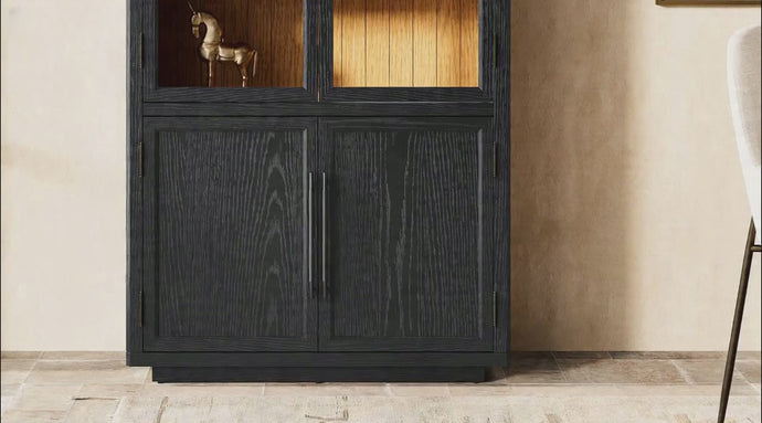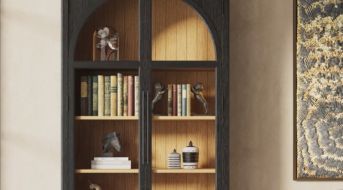 - Dual-function design features "Glass-Front Display Storage" with an elegant arch and a lower cabinet for "Multi-Tier Interior Storage" to keep items organized.
