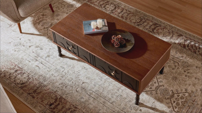 The Marais Collection reimagines the balance between vintage charm and modern drama, a philosophy perfectly embodied by the Marais 2-Drawer Storage Coffee Table. This captivating centerpiece blends organic warmth with bold geometric artistry, featuring classic turned solid wood legs and a rich wood casing that frames dual drawers with a textured, relief-carved black facade. Finished with gleaming brass-tone knobs to create a rhythmic play of light and shadow, it offers essential hidden storage while delivering a sophisticated, architectural aesthetic to your living space.