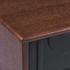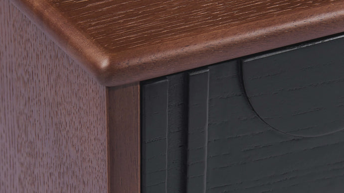 - The two-tone finish is achieved through a multi-step process, contrasting the natural warmth of the wood grain with the matte sophistication of the black textured fronts.