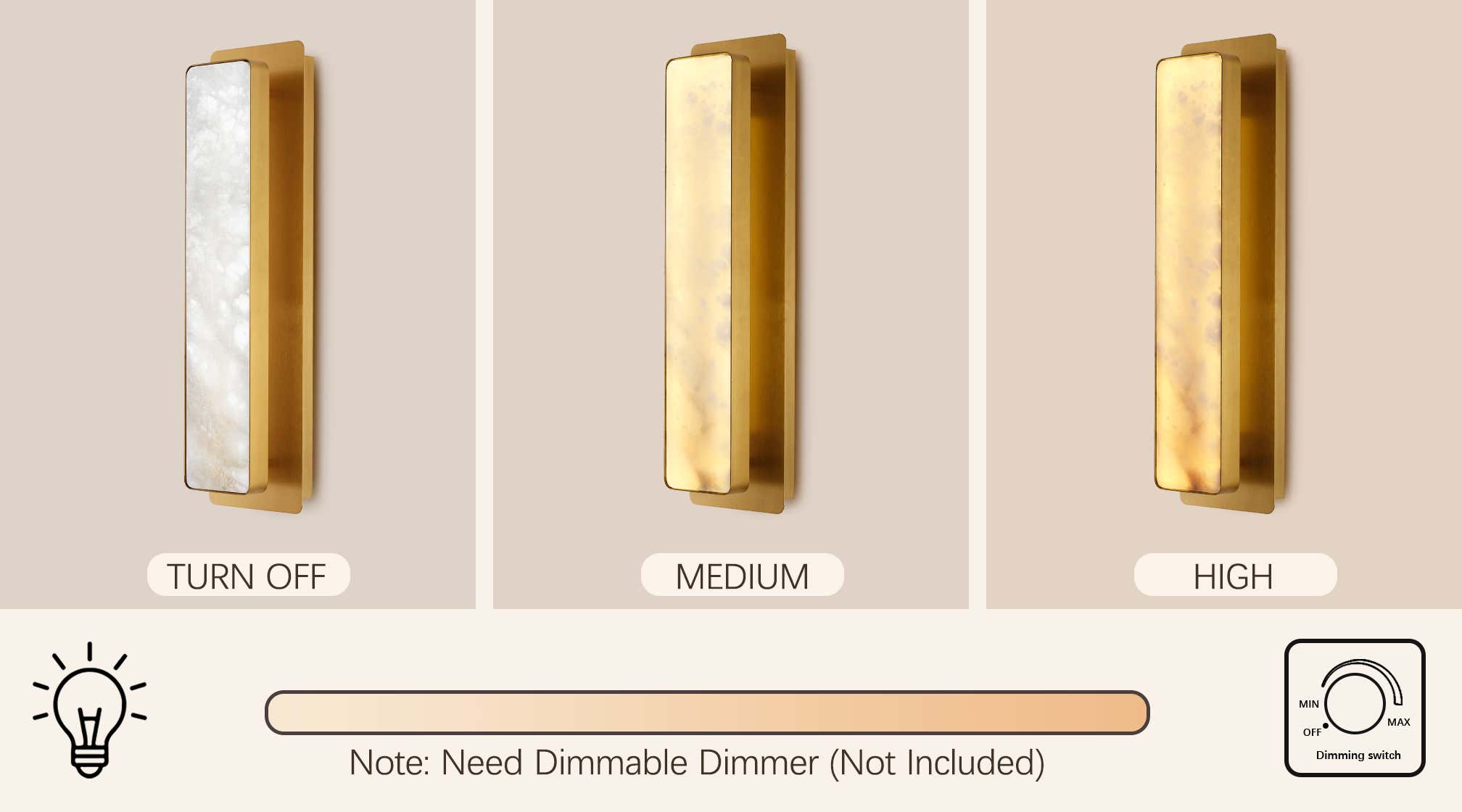 Crafted from natural alabaster stone, this fixture delivers a warm, softly diffused glow with fully dimmable lighting. Please note that a compatible wall dimmer is required and should be prepared by the customer. The inherent translucence and organic veining of alabaster create an elegant atmosphere that adjusts effortlessly to your preferred brightness.