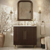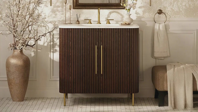 Providing a safe, bump-free environment for families with energetic children or pets, this vanity features thoughtfully curved edges that soften the silhouette. This ergonomic design is beautifully accented by brushed gold hardware and slender legs, creating a stunning visual contrast against the dark fluted wood that brings a warm, opulent glow to your bathroom.