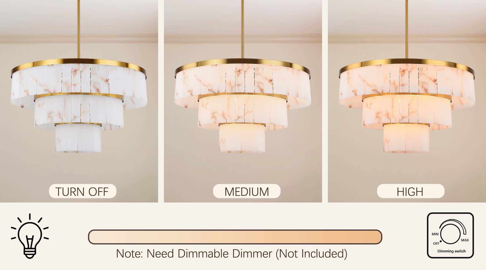 The Round Alabaster Chandelier, 3 Tiers is absolutely stunning! The alabaster material gives it a natural, luxurious look that shines beautifully both during the day and at night. The quality is excellent .It feels solid and well-made, and it truly looks far more expensive than it actually is.