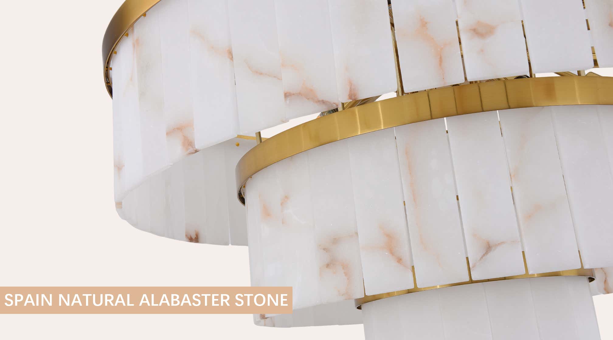 This image highlights the refined beauty of Spain-sourced natural alabaster, renowned for its soft translucence and cloud-like veining. Each stone panel displays unique patterns formed over thousands of years, allowing light to pass through with a warm, diffused glow. The material’s natural variations make every fixture one-of-a-kind, adding depth, elegance, and artisanal character to the design.