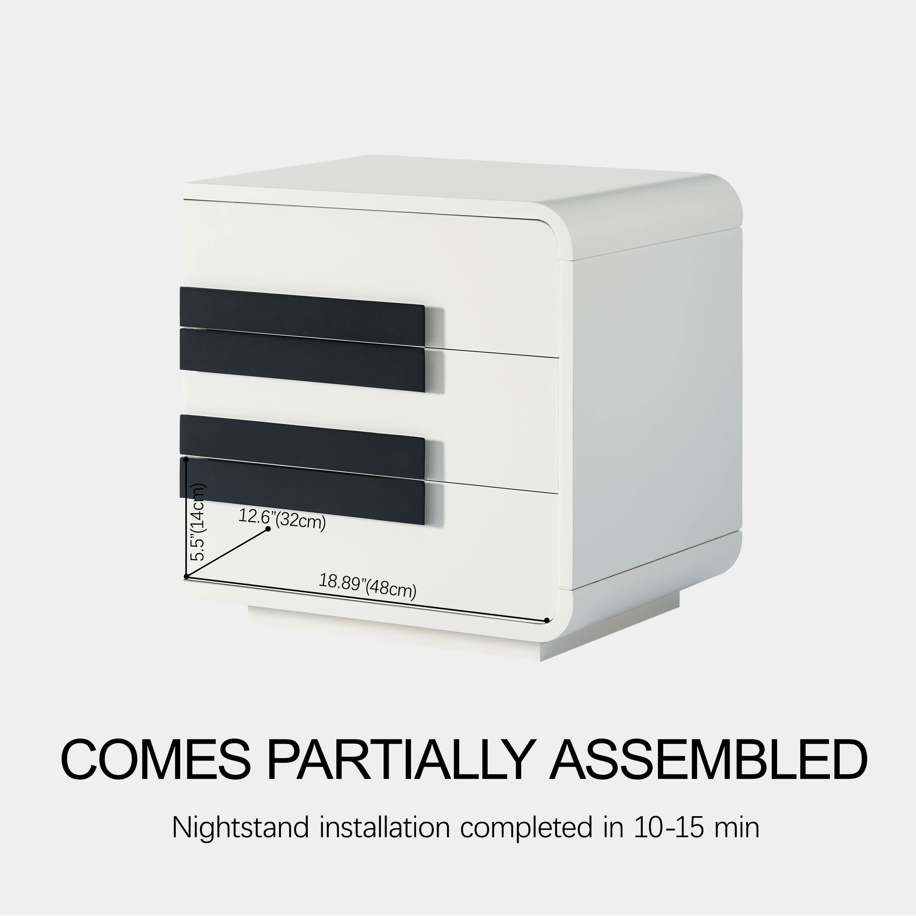 The Soren Nightstand embodies modern minimalism with its sleek and elegant design. Rounded edges contrast with bold black-and-white tones, creating a clean and refined visual effect. Built-in LED lighting strips within the base add warmth and sophistication, transforming it from a functional storage unit into a captivating focal point in any living room.